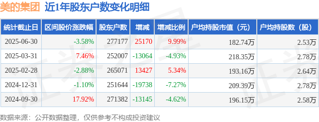 从股价来看,2025年3月31日至2025年6月30日,美的集团区间跌幅为3.58%,在此期间股东户数增加2.52万户,增幅为9.99%。